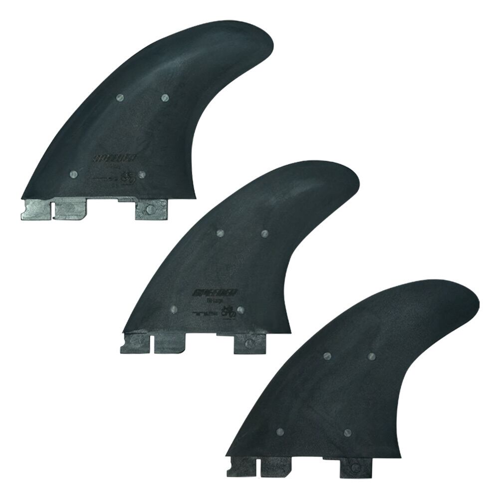 【 TLS SPEEDER FIN TRI-LARGE SET FCS2 対応 】 フィンに”スプリング(バネ)”を内蔵することで、驚くべきスピードをもたらす最新テクノロジーフィン。航空機で使われた軽量かつ高強度のカーボンを再利用。 ■ SIDE FIN BASE : 116mm DEPTH : 119mm ■ CENTER FIN BASE : 114mm DEPTH : 114mm ■ 仕様 ・FCS 2 タブ対応 *FCS 2 タブのリア側をイモネジで固定してご利用ください。 *イモネジは含まれておりません。 *FCS 1 タブは非対応 ・3枚フィンセット ・リサイクルカーボン+高強度樹脂のベース ・サビに強いスチール製スプリング内臓 ・カーボンブラックカラー ・日本製