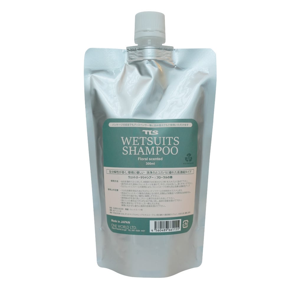 【 TLS WETSUITS SHAMPOO FLORAL|ウェットシャンプー フローラル 】 ■ 仕様 ・エコパッケージ ・生分解性が高く環境に優しい ・洗浄力とコスパに優れた高濃縮タイプ ・お手持ちのTLSウェットシャンプー タイドの詰め替え用としても ・安心の日本製 ・内容量:300ml ■ 関連商品 ウェットスーツシャンプー&ソフナー TLS WATER BOX|ウェットスーツの洗濯にピッタリ!