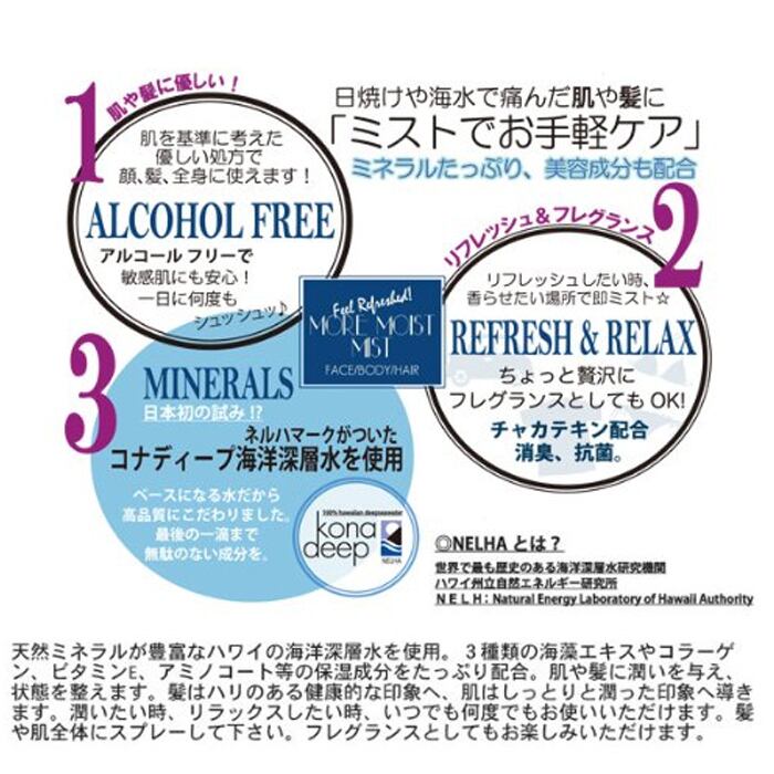 天然ミネラルが豊富なハワイの海洋深層水を使用。 3種類の海藻エキスやコラーゲン、ビタミンE、アミノコート等の保湿成分をたっぷり配合。肌や髪に潤いを与え、上体を整えます。 ・海洋深層水使用 ・全身用リフレッシュミスト ・アルコールフリー 内容量 : 200ml 『リフレッシュ&リラックス』ちょっと贅沢に、フレグランスとしても使用可能 海あがりに簡単にお肌をケア!