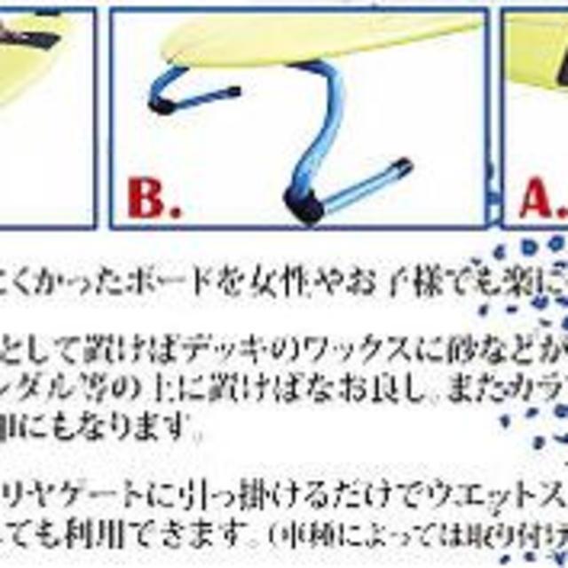 【キャリらっくん】女性やお子様がロングボードの持ち運びに大変便利なボードキャリーハンドルです。車のハッチバックに引っ掛けるだけで、ハンガーバーとしてウェットスーツやバスタオル等を干す事が出来ます。また、キャリらっくんを地面に置き、ワックスアップ時にも使用でき、3Way Board Carry Handleです。