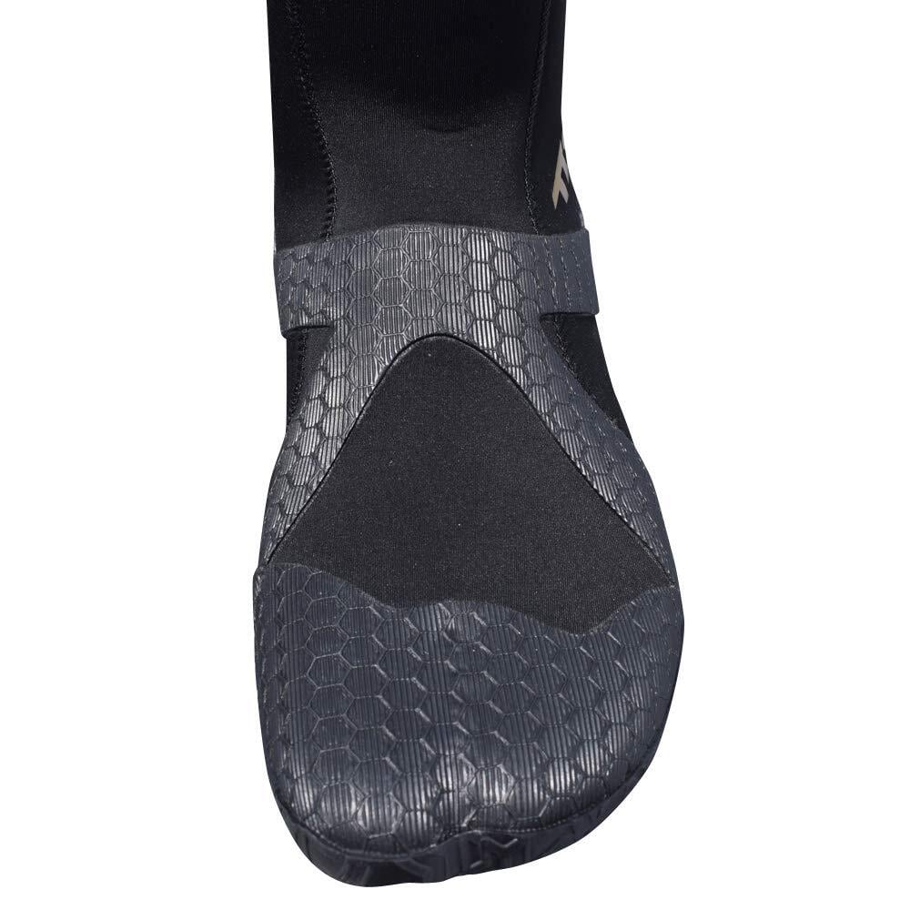 保温力のあるストレッチ素材に加え足型を固定するへクセルスキンで安定感と保温力をキープします。足首部分にはスキン素材の切り返しを付けることで水の侵入を最小限に抑えて快適なウィンターサーフを提供します。