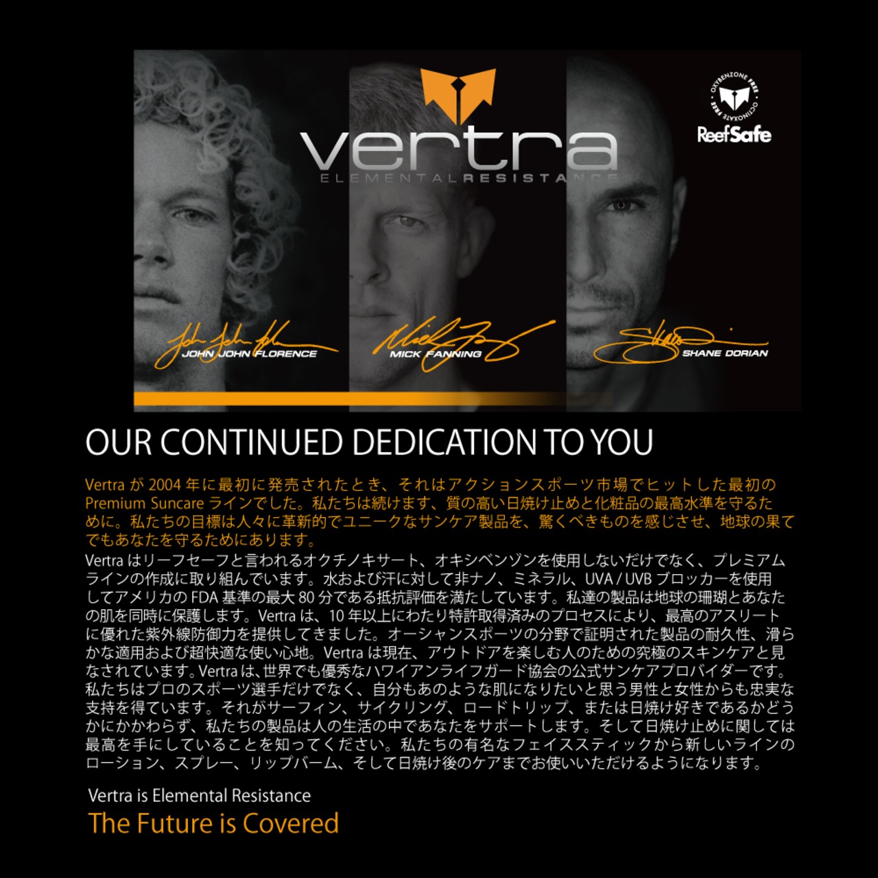 Vertra(バートラ)は数多くの世界のトップサーファーをサポートしハワイのライフセーバーたちを統括する組織 Hawaiian Lifeguard Associationの公式プロバイダーです。 The Skin Cancer Foundation(皮膚癌財団)はこの商品を 日焼け防止にとても有効だと推奨しています。