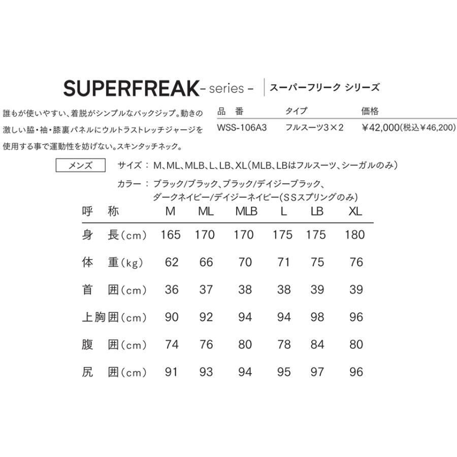予約商品 日本正規品 ファスナーバックジップ 3×2mm フルスーツ ■SUPERFREAK series■ 最新のテクノロジーを驚きのコストパフォーマンスで送り出すスーパーフリークシリーズ。 スタイルや用途にあわせてベストな開口デザインを選択可能ソフトな肌触りの「ファイアーウォール」起毛素材を裏面全身に使用。 吸水率の低いナイロン糸を使用し脱水性が良く乾きが早い。 さらに、リサイクルされたペットボトルが紡がれている。 この合成繊維は温室効果ガスの排出が少なく、水とエネルギーを節約することが出来ます。 既製サイズ、限定カラーの限定既製生産品。 【SUPERFREAK】 誰もが使いやすい、着脱がシンプルなバックジップ。動きの激しい脇、袖、膝裏パネルにウルトラストレッチジャージを使用することで運動性能を妨げない。スキンタッチネック。 ドライネック仕様。ドレインシステム付き。3×2mm厚。
